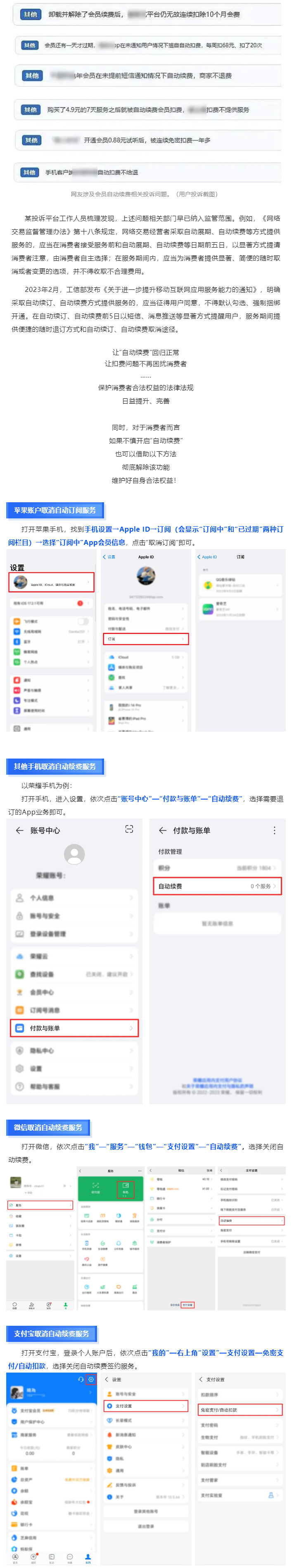 在會員不知情下,未提醒、未經(jīng)同意自動扣費;以免費試用、低價體驗誘導(dǎo)充值后,變相強制開啟用戶扣(續(xù))費服務(wù)功能;開通會員在期限內(nèi)用完后仍繼續(xù)被扣費;APP自動續(xù)費開通標(biāo)識不清楚,取消步驟多、流程復(fù)雜;自動續(xù)費悄然漲價,花的錢反而更多等等。