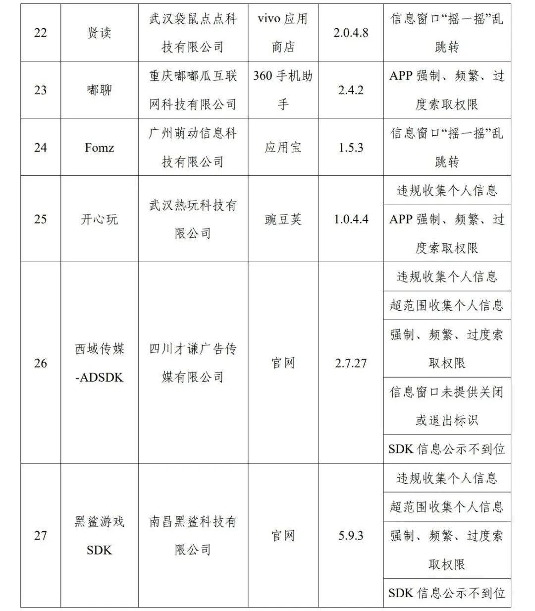 工業(yè)和信息化部高度重視用戶權益保護工作,依據(jù)《個人信息保護法》《網(wǎng)絡安全法》《電信條例》《電信和互聯(lián)網(wǎng)用戶個人信息保護規(guī)定》等法律法規(guī),持續(xù)整治APP侵害用戶權益的違規(guī)行為。近期,工信部組織第三方檢測機構進行抽查,共發(fā)現(xiàn)27款APP及SDK存在侵害用戶權益行為(詳見附件),現(xiàn)予以通報。上述APP及SDK應按有關規(guī)定進行整改,整改落實不到位的,我部將依法依規(guī)組織開展相關處置工作。