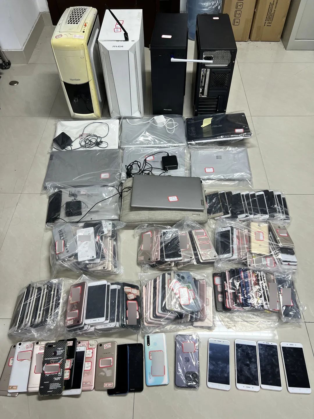 調(diào)查發(fā)現(xiàn),該團伙的主要負責人金某和員工都曾有保險公司從業(yè)經(jīng)歷。他們勾結(jié)張某、龔某等人,購買投保客戶的個人信息。通過電話推銷、上門拜訪等方式,他們誘導(dǎo)投保人退辦之前購買的保險,再以投保人的名義向保險公司索要退款,從中牟取暴利。掌握相關(guān)證據(jù)后,公安網(wǎng)安部門立刻組織精干警力奔赴相關(guān)地市,成功抓獲以金某為首的犯罪團伙成員33名,現(xiàn)場扣押作案手機200余部、電腦14臺。經(jīng)查,該團伙累計作案百余起,非法獲利高達200余萬元。