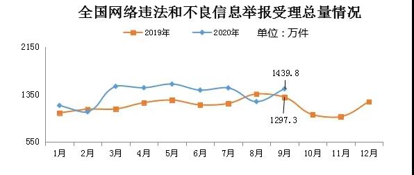 2020年9月,全國(guó)各級(jí)網(wǎng)絡(luò)舉報(bào)部門受理舉報(bào)1439.8萬(wàn)件,環(huán)比增長(zhǎng)16.3%、同比增長(zhǎng)11.0%。其中,中央網(wǎng)信辦(國(guó)家互聯(lián)網(wǎng)信息辦公室)違法和不良信息舉報(bào)中心受理舉報(bào)18.8萬(wàn)件,環(huán)比下降20.6%、同比增長(zhǎng)2.9%;各地網(wǎng)信辦舉報(bào)部門受理舉報(bào)140.1萬(wàn)件,環(huán)比下降0.9%、同比下降3.4%;全國(guó)主要網(wǎng)站受理舉報(bào)1280.9萬(wàn)件,環(huán)比增長(zhǎng)19.4%,同比增長(zhǎng)13.0%。
