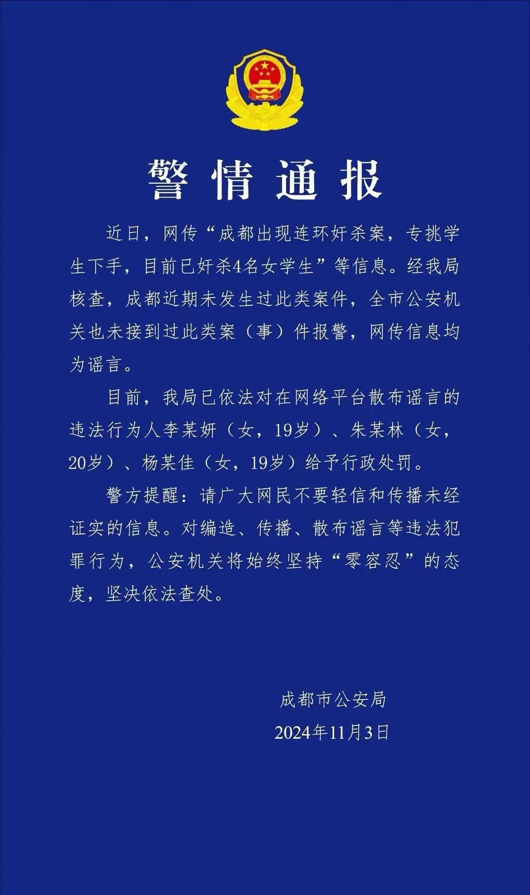 11月3日,成都市公安局發(fā)布警情通報:近日,網(wǎng)傳“成都出現(xiàn)連環(huán)奸殺案,專挑學生下手,目前已奸殺4名女學生”等信息。經(jīng)成都市公安局核查,成都近期未發(fā)生過此類案件,全市公安機關(guān)也未接到過此類案(事)件報警,網(wǎng)傳信息均為謠言。