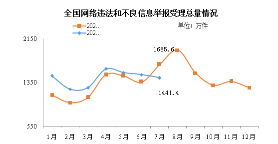 2022年7月,全國網(wǎng)信舉報(bào)工作部門、主要網(wǎng)站平臺受理舉報(bào)1441.4萬件,環(huán)比下降3.8%、同比下降14.5%。其中,中央網(wǎng)信辦(國家互聯(lián)網(wǎng)信息辦公室)違法和不良信息舉報(bào)中心受理舉報(bào)54.4萬件,環(huán)比增長18.9%、同比增長73.0%;各地網(wǎng)信舉報(bào)工作部門受理舉報(bào)77.3萬件,環(huán)比下降0.9%、同比下降31.8%;全國主要網(wǎng)站平臺受理舉報(bào)1309.7萬件,環(huán)比下降4.8%、同比下降15.0%。 在全國主要網(wǎng)站平臺受理的舉報(bào)中,主要商業(yè)網(wǎng)站平臺受理量占56.7%,達(dá)742.6萬件。 在各級網(wǎng)信舉報(bào)工作部門指導(dǎo)下,目前全國各主要網(wǎng)站平臺不斷暢通舉報(bào)渠道、受理處置網(wǎng)民舉報(bào)。歡迎廣大網(wǎng)民積極參與網(wǎng)絡(luò)綜合治理,共同維護(hù)清朗網(wǎng)絡(luò)空間。