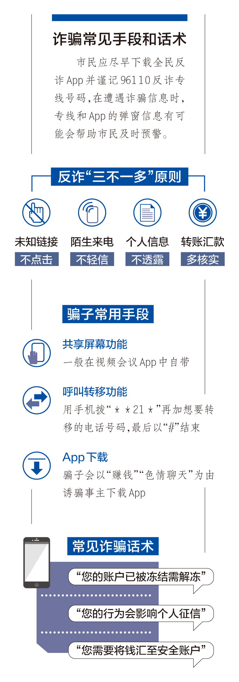 王佳表示,現(xiàn)在國(guó)家在大力推廣全民反詐App以及96110反詐專線,市民應(yīng)盡早下載App并謹(jǐn)記專線號(hào)碼,在遭遇詐騙信息時(shí),專線和App的彈窗信息有可能會(huì)幫助市民及時(shí)預(yù)警。此外,反詐中還有一個(gè)三不一多原則需要牢記:“未知鏈接不點(diǎn)擊 陌生來(lái)電不輕信 個(gè)人信息不透露 轉(zhuǎn)賬匯款多核實(shí)”。