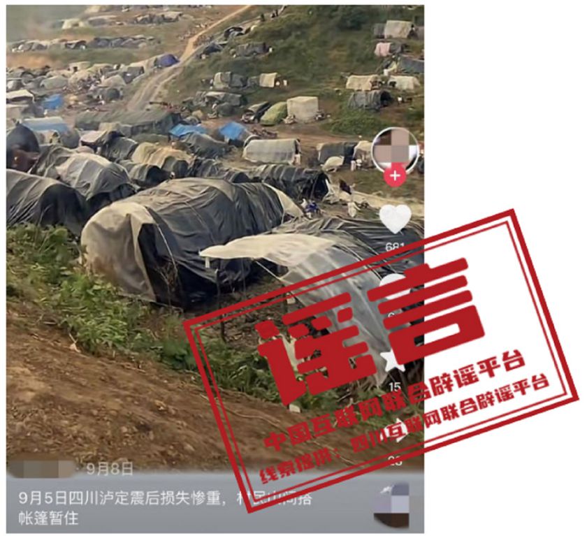 這類謠言往往通過移花接木拼湊而成,有的冒用不相干的圖片或視頻企圖自證,有的依靠PS等拼接技術(shù)進行偽造,還有的利用人工智能和大數(shù)據(jù)生成仿真音視頻信息。如“重慶嘉陵江被曬干了,兩名男子騎摩托車橫渡嘉陵江”“四川地震后村民在山腳下自搭帳篷居住”等謠言,均屬于用“移花接木”手法編撰的虛假信息:前者實為水位降低的自然情況,橫渡視頻的拍攝地點是長江珊瑚壩而非嘉陵江;后者則是四川樂山筍農(nóng)打筍時臨時搭建的休息帳篷。此外,“浙江寧波北侖、慈溪被水淹”等視頻還采用特效合成手法制造謠言,著實居心不良。