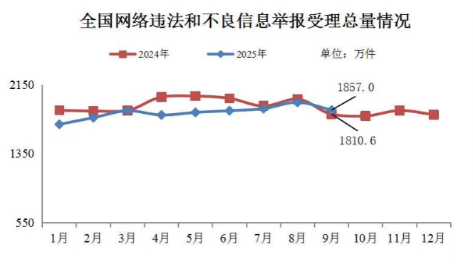 2025年9月,中央網(wǎng)信辦舉報(bào)中心指導(dǎo)全國各級網(wǎng)信舉報(bào)工作部門、主要網(wǎng)站平臺受理網(wǎng)民舉報(bào)色情、賭博、侵權(quán)、謠言等違法和不良信息1857萬件,環(huán)比下降4.6%、同比增長2.6%。其中,中央網(wǎng)信辦舉報(bào)中心受理舉報(bào)39.4萬件,環(huán)比下降7.4%、同比下降1.6%;各地網(wǎng)信舉報(bào)工作部門受理舉報(bào)100.8萬件,環(huán)比增長58.8%、同比下降9%;全國主要網(wǎng)站平臺受理舉報(bào)1716.8萬件,環(huán)比下降6.7%,同比增長3.4%。