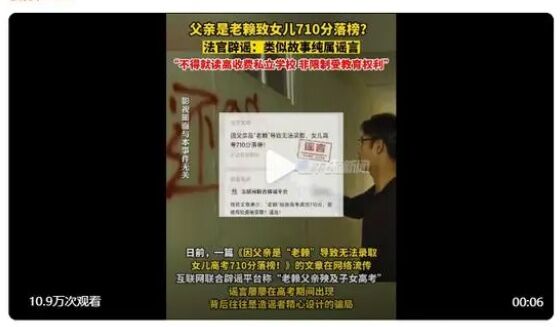 昨天,一則《父親是“老賴”導(dǎo)致女兒710分落榜?法官:純屬謠言故事版本迥異情節(jié)驚人雷同》的新聞沖上頭條熱榜。新聞稱,日前,一篇《因父親是“老賴”導(dǎo)致無(wú)法錄取,女兒高考710分落榜!》的文章在微信流傳,該文稱,一個(gè)女生高考考了710分,卻因父親貸款失信而被學(xué)校拒絕。招生辦認(rèn)為她的父親不講信用,女兒也很可能受到影響,高校不能錄取品行不端的人。
