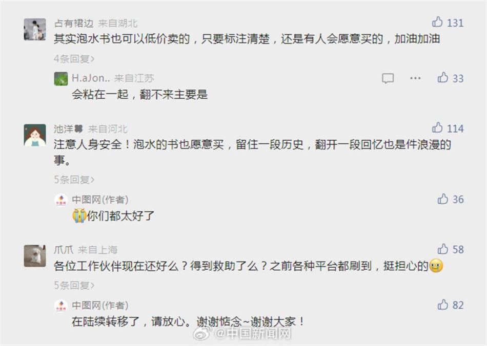 更有網(wǎng)友表示即使泡水書他們也要買,“泡水不那么嚴重的書還是可以繼續(xù)銷售的?!薄跋缺Wo好人身安全,等洪水過了開儲值卡吧,反正會一直買書,又不是扔掉了,不用覺得不好意思。”“我真的也愿意買泡過水的書,加油!這是大家共患難的經(jīng)歷,注意安全!到底誰在真心做書,真心為了讀者,我們都看得見!”