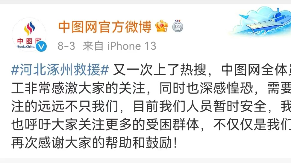 近日,京津冀持續(xù)強降雨,給當?shù)卦S多企業(yè)造成損失。其中中圖網(wǎng)就是其中之一。中圖網(wǎng)8月2日發(fā)文稱,其位于涿州的倉儲中心被洪水淹了,預(yù)計至少80%的書(400多萬冊,三億碼洋以上)會報廢。據(jù)悉,中圖網(wǎng)的圖書倉庫原本在北京,為了降低租金成本,將倉庫從北京搬遷到涿州等地,沒想到這場暴雨幾乎讓他們遭遇毀滅性的打擊。