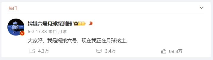 今年6月初,嫦娥六號成功落月,并在月球背面南極-艾特肯盆地完成了人類首次月背采樣。與此同時,@嫦娥六號月球探測器 也用一句“大家好,我是嫦娥六號,現(xiàn)在我正在月球挖土”,宣告自己“登陸”微博。