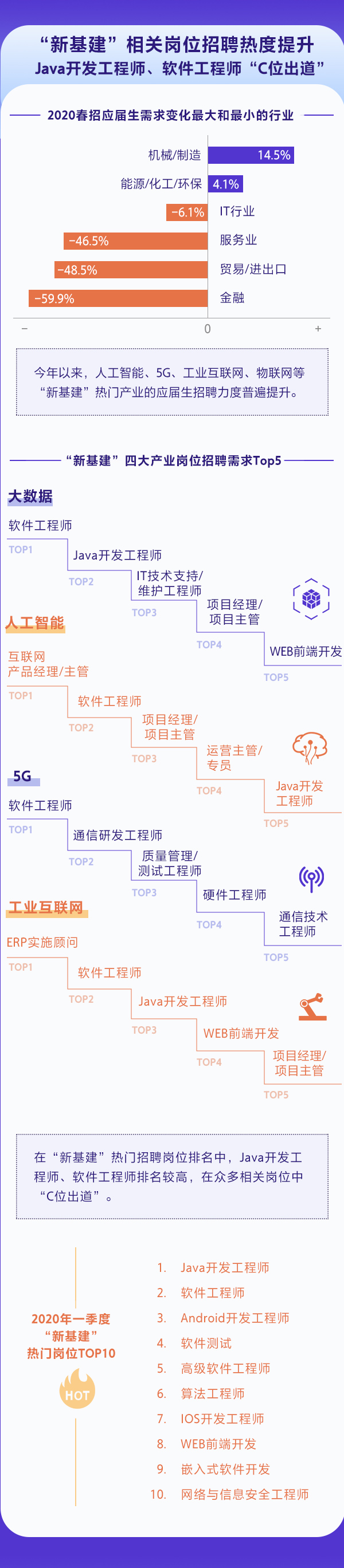 受疫情影響,今年以來,新基建相關(guān)熱門產(chǎn)業(yè)的應(yīng)屆生招聘力度普遍提升。據(jù)BOSS直聘研究院最新發(fā)布的報告顯示,在2020年春招季,5G、人工智能、物聯(lián)網(wǎng)、云計算、集成電路、大數(shù)據(jù)等領(lǐng)域的應(yīng)屆生崗位比例普遍增長了1-5個百分點,為專業(yè)對口和有興趣進入“新基建”領(lǐng)域的應(yīng)屆生提供了良好機會。