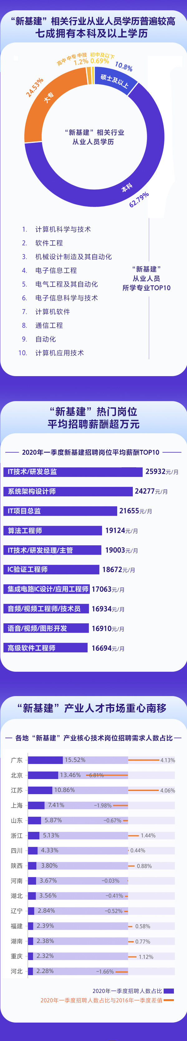 值得注意的是,目前新基建相關(guān)產(chǎn)業(yè)從業(yè)人員學(xué)歷普遍較高,其中七成擁有本科及以上學(xué)歷。據(jù)智聯(lián)招聘統(tǒng)計,當(dāng)前業(yè)內(nèi)人才中有10.8%擁有碩士及以上學(xué)歷,62.79%擁有本科學(xué)歷,合計超過七成。