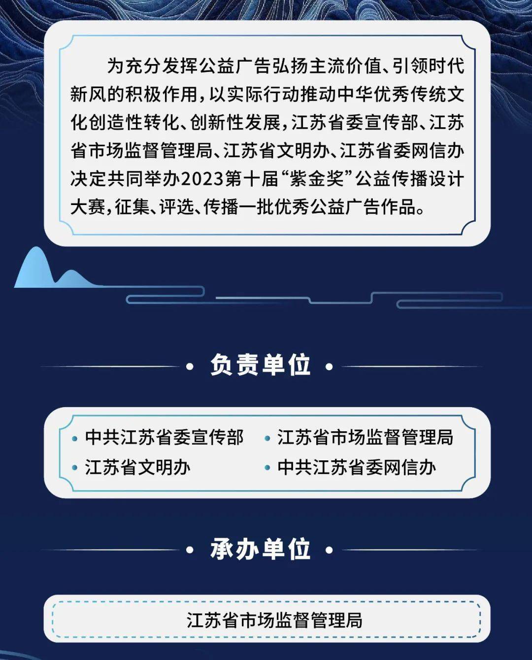 近日,由省委宣傳部、省市場監(jiān)管局、省文明辦、省委網(wǎng)信辦共同舉辦,省市場監(jiān)管局具體承辦的2023第十屆“紫金獎”公益?zhèn)鞑ピO(shè)計大賽正式公布賽事主題。