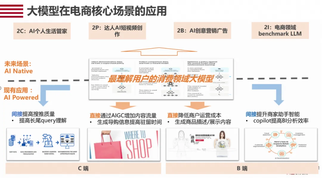 因此,AI幫助商戶降本增效與提升供給質(zhì)量,智能化運營幫助從業(yè)者(特別是中小商家)大幅度降低經(jīng)營成本,促進更有創(chuàng)意的良性競爭。在用戶端提升消費者體驗,不斷釋放消費潛力。在產(chǎn)業(yè)側(cè),加速供需的良性循環(huán),使人-貨-場鏈接更有效、更多元、更便捷。