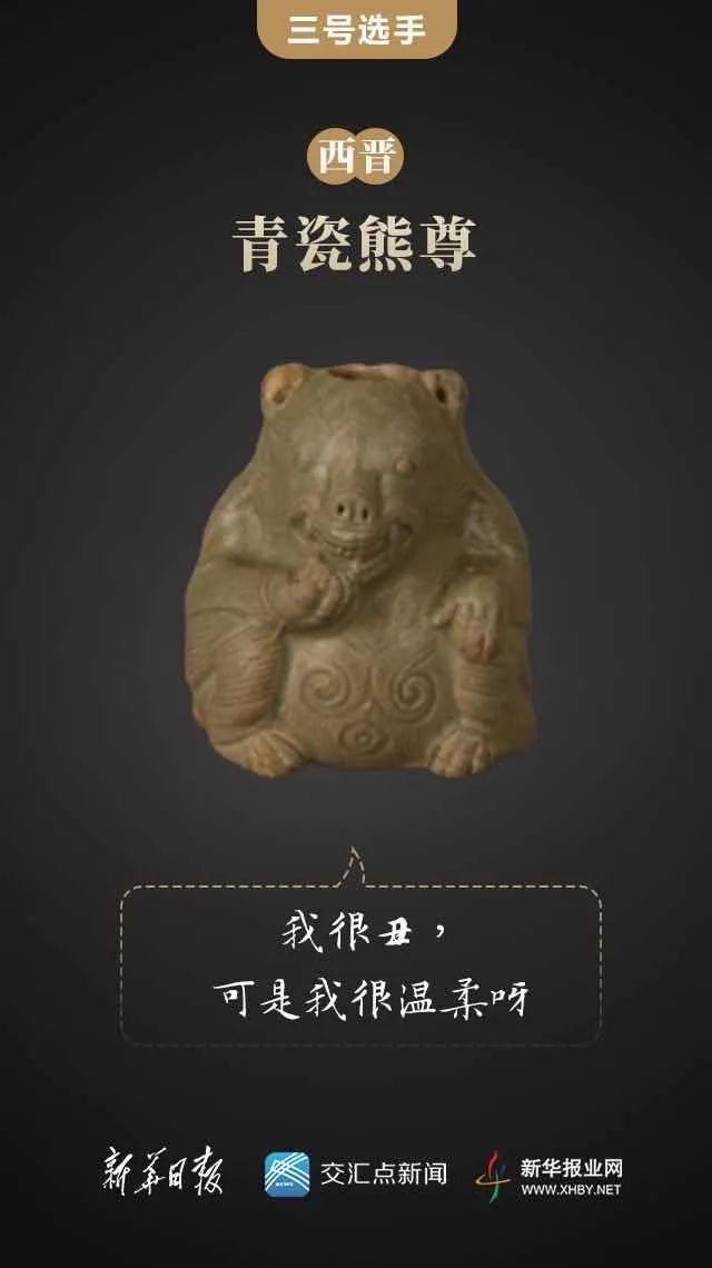 灰色胎,青黃色釉。造型作一熊踞坐吃食狀。通體飾茸毛狀紋和卷曲紋,頂部有一圓孔,可能以插燭或作酒器或作水滴之用。