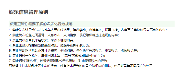 而針對(duì)粉絲群體聚集的社區(qū)、平臺(tái)等整治措施也非常明確。6月18日,豆瓣通過官方賬號(hào)發(fā)布了《關(guān)于開展“清朗·‘飯圈’亂象整治”專項(xiàng)行動(dòng)的公告》,建立了《娛樂信息管理原則》規(guī)范,明確了七條“禁止性”條款。為保障治理成效,豆瓣將治理范圍擴(kuò)展到“娛樂信息”,旨在對(duì)包括“飯圈亂象”在內(nèi)的各種娛樂信息亂象,集中開展規(guī)范治理。