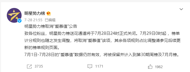 除了豆瓣外,微博也是粉絲群體聚集的主要平臺(tái)。8月6日,微博宣布下線“明星勢(shì)力榜”,“明星勢(shì)力榜”是反映明星綜合熱度的榜單,今年7月,該榜單取消了其中的“愛慕值送花”計(jì)分規(guī)則,微博管理員官方微博表示,最近一年來部分明星粉絲群體非理性應(yīng)援、刷榜等問題愈演愈烈,為倡導(dǎo)粉絲理智追星,決定下線“明星勢(shì)力榜”。