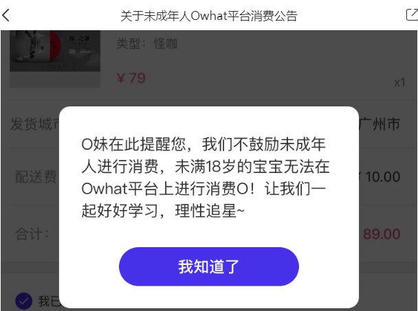 8月9日,“桃叭”發(fā)布了公告,對(duì)APP內(nèi)聊天室、安利廣場(chǎng)等功能板塊展開自查,目前已屏蔽數(shù)千條人身攻擊、引戰(zhàn)、廣告等違規(guī)發(fā)言,并對(duì)九百余個(gè)賬號(hào)進(jìn)行永久封禁處理。并且即將推出“青少年模式”,將對(duì)未成年人參與應(yīng)援的行為做出更嚴(yán)格的監(jiān)管。另一明星粉絲互動(dòng)平臺(tái)“Owhat”也在首頁上放出《關(guān)于未成年人Owhat平臺(tái)消費(fèi)公告》表示將持續(xù)推出未成年人強(qiáng)提醒與保護(hù),從8月初起將限制未成年人消費(fèi)。目前,未成年人在該平臺(tái)下單時(shí)會(huì)彈出相應(yīng)提示,未滿18歲的用戶無法在平臺(tái)上消費(fèi)。(記者 王汝希)