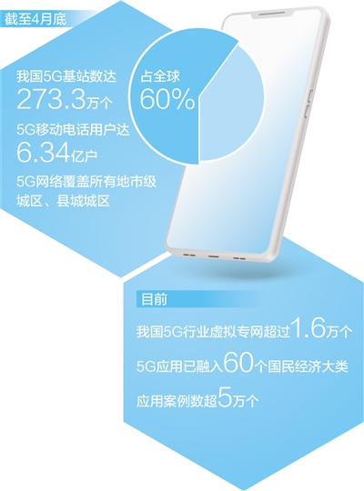 工業(yè)和信息化部統(tǒng)計顯示,截至今年4月底,我國5G基站數(shù)達到273.3萬個,占全球60%;5G移動電話用戶達6.34億戶,5G網(wǎng)絡覆蓋所有地市級城區(qū)、縣城城區(qū)。