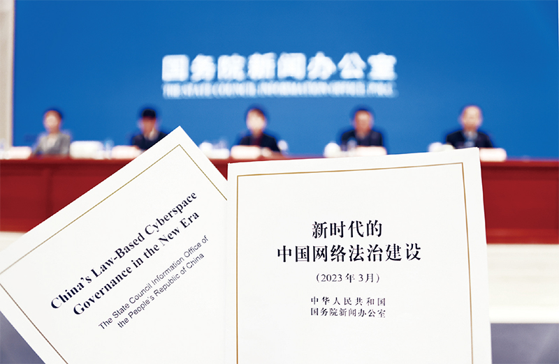 2023年3月16日,國務(wù)院新聞辦公室在北京發(fā)布《新時代的中國網(wǎng)絡(luò)法治建設(shè)》白皮書,并舉行新聞發(fā)布會。圖為當日拍攝的白皮書。 新華社記者 潘旭/攝