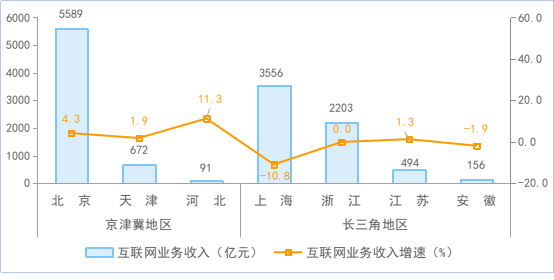 京津冀地區(qū)互聯(lián)網(wǎng)業(yè)務(wù)收入穩(wěn)步增長。京津冀地區(qū)完成互聯(lián)網(wǎng)業(yè)務(wù)收入6352億元,同比增長4.1%,占全國互聯(lián)網(wǎng)業(yè)務(wù)收入的35.2%。長三角地區(qū)完成互聯(lián)網(wǎng)業(yè)務(wù)收入6409億元,同比下降6.3%,占全國互聯(lián)網(wǎng)業(yè)務(wù)收入的35.5%。