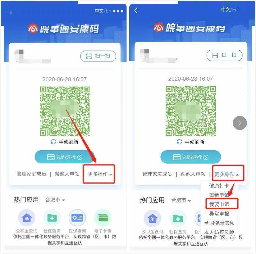 第一步:打開“皖事通”APP,進(jìn)入“安康碼”界面,找到碼色下方“更多操作”,點(diǎn)擊“我要申訴”。
