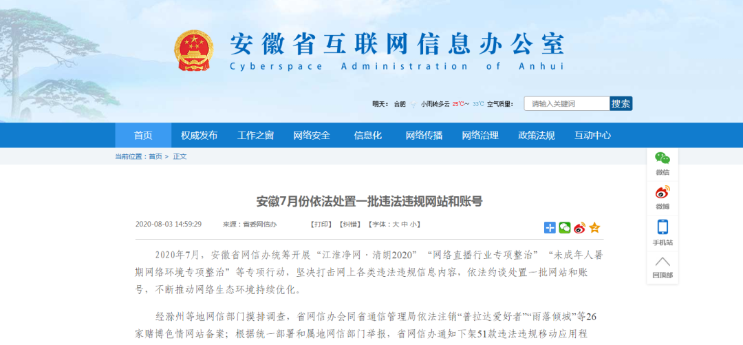 2020年7月,安徽省網(wǎng)信辦統(tǒng)籌開展“江淮凈網(wǎng)·清朗2020”“網(wǎng)絡(luò)直播行業(yè)專項整治”“未成年人暑期網(wǎng)絡(luò)環(huán)境專項整治”等專項行動,堅決打擊網(wǎng)上各類違法違規(guī)信息內(nèi)容,依法約談處置一批網(wǎng)站和賬號,不斷推動網(wǎng)絡(luò)生態(tài)環(huán)境持續(xù)優(yōu)化。