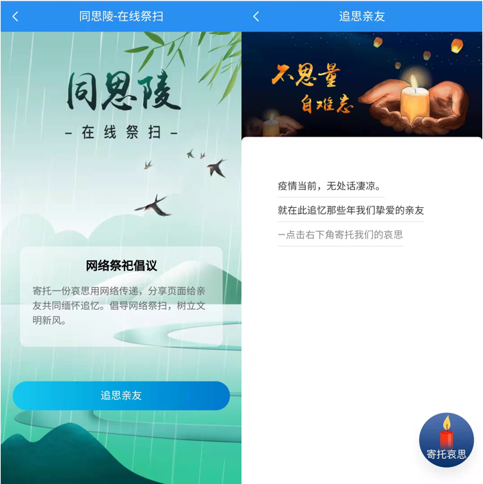 2、進入“網上祭祀”服務頁面,閱讀“網絡祭祀倡議”后點擊“追思親友”,進入頁面后點擊“寄托哀思”即可追思親友。