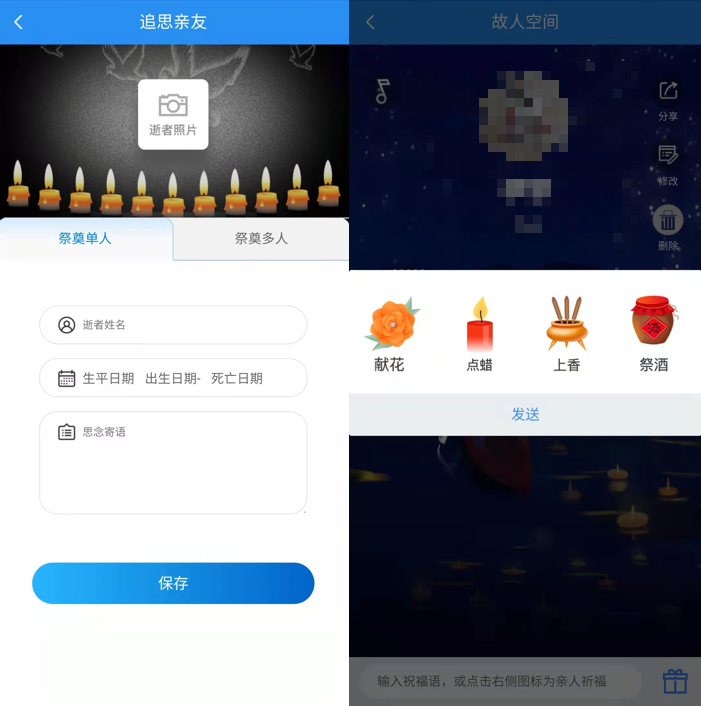 3、在“追思親友”頁面可以選擇祭奠單人或者祭奠多人,輸入相關信息后進入“故人空間”,可以通過獻花、點蠟、上香和祭酒等方式來表達心意、寄托哀思。