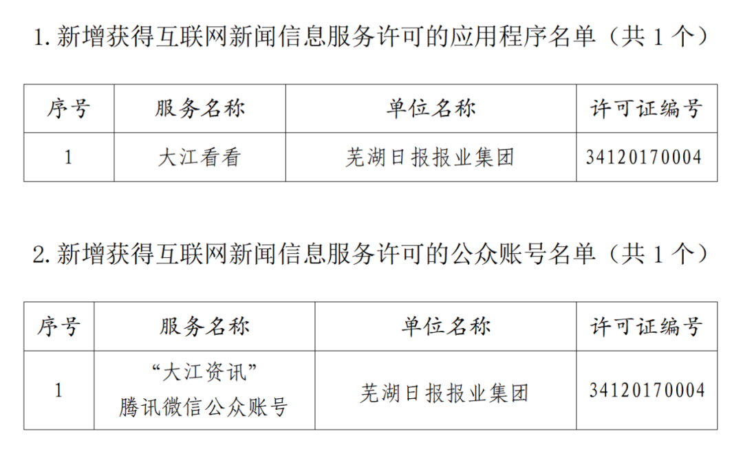 近日,安徽省互聯(lián)網(wǎng)信息辦公室按照《互聯(lián)網(wǎng)新聞信息服務(wù)管理規(guī)定》和國家網(wǎng)信辦有關(guān)工作要求,批準(zhǔn)蕪湖日報(bào)報(bào)業(yè)集團(tuán)的2個(gè)項(xiàng)目從事互聯(lián)網(wǎng)新聞信息服務(wù),包括互聯(lián)網(wǎng)移動(dòng)應(yīng)用程序“大江看看”、騰訊微信公眾賬號(hào)“大江資訊”。