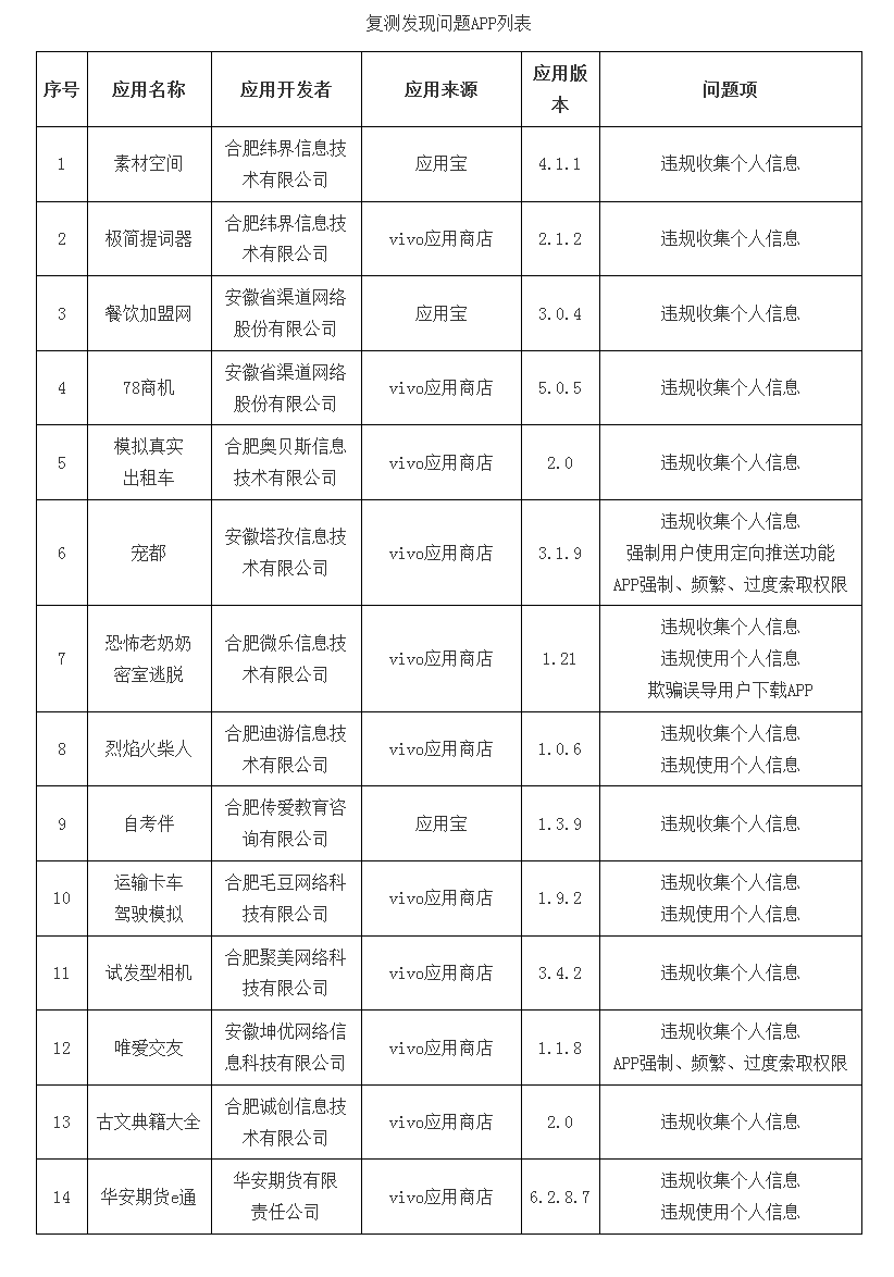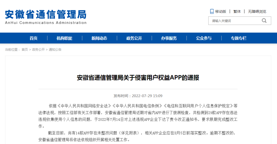 依據(jù)《中華人民共和國網(wǎng)絡安全法》《中華人民共和國電信條例》《電信和互聯(lián)網(wǎng)用戶個人信息保護規(guī)定》等法律法規(guī),按照工信部有關工作部署,安徽省通信管理局近期對省內(nèi)APP進行了撥測檢查,共檢測到29款APP存在違法違規(guī)收集使用個人信息的問題,于2022年7月14日對上述違規(guī)APP企業(yè)下達了責令改正通知書,要求限期完成整改工作。