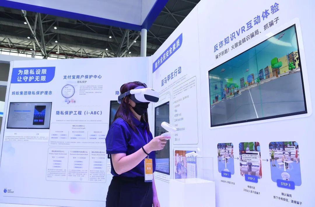 螞蟻集團展臺工作人員演示反詐知識VR互動體驗。
