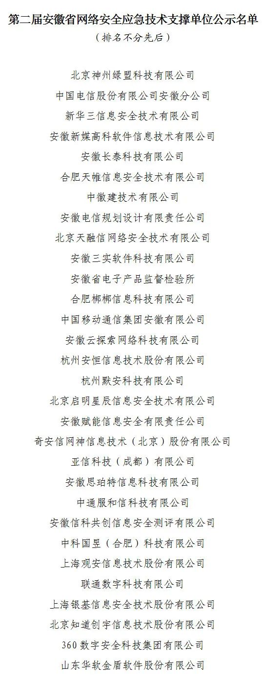 根據(jù)中共安徽省委網(wǎng)絡安全和信息化委員會辦公室、國家計算機網(wǎng)絡應急技術處理協(xié)調中心安徽分中心《關于遴選第二屆安徽省網(wǎng)絡安全應急技術支撐單位的公告》,經(jīng)單位自主申報、初步審核和專家評審等環(huán)節(jié),擬遴選30家單位為第二屆安徽省網(wǎng)絡安全應急技術支撐單位,現(xiàn)將擬入選單位名單(附后)予以公示。