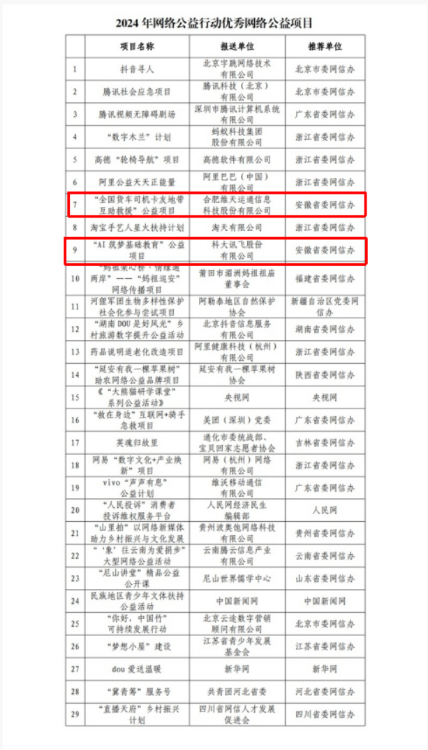 近日,在成都舉行的中國網(wǎng)絡(luò)文明大會,發(fā)布了2024年網(wǎng)絡(luò)公益行動優(yōu)秀網(wǎng)絡(luò)公益項(xiàng)目29個典型案例,由安徽省委網(wǎng)信辦報送的“全國貨車司機(jī)卡友地帶互助救援”和“AI筑夢基礎(chǔ)教育”網(wǎng)絡(luò)公益項(xiàng)目成功入選。