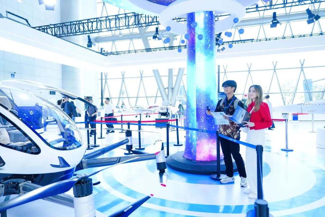 印度尼西亞網(wǎng)紅博主陳俊偉(左)、俄羅斯網(wǎng)紅博主麗娜參觀無人駕駛載人航空器。趙博 攝