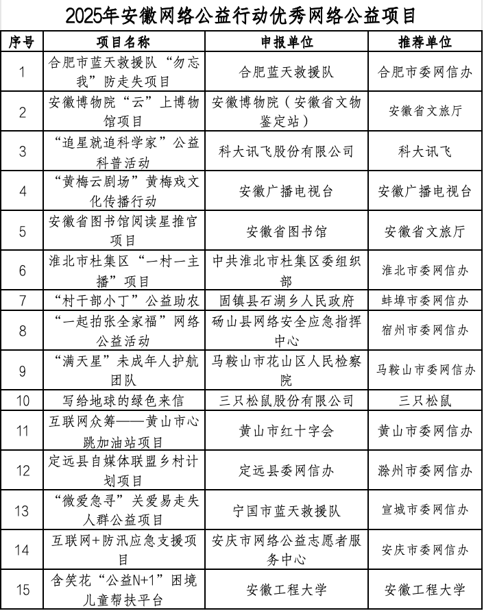 本次評選活動由省委網(wǎng)信辦主辦、安徽省互聯(lián)網(wǎng)行業(yè)聯(lián)合會承辦,旨在發(fā)揮互聯(lián)網(wǎng)賦能公益發(fā)展、為民惠民的重要作用,營造網(wǎng)絡(luò)公益全民參與、全網(wǎng)行動的良好氛圍?;顒邮艿饺「鹘鐝V泛關(guān)注和積極響應(yīng),省內(nèi)各類公益主體踴躍參與。經(jīng)過單位推薦、材料審核、專家評審等環(huán)節(jié),15項具有代表性、示范性和影響力的優(yōu)秀網(wǎng)絡(luò)公益項目脫穎而出(名單如下)。
