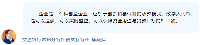 當(dāng)前,常州持續(xù)探索數(shù)字人民幣“場景上新”,在企業(yè)信貸領(lǐng)域加大數(shù)字人民幣的推廣應(yīng)用,為常州企業(yè)帶來更高效安全的金融服務(wù)。
