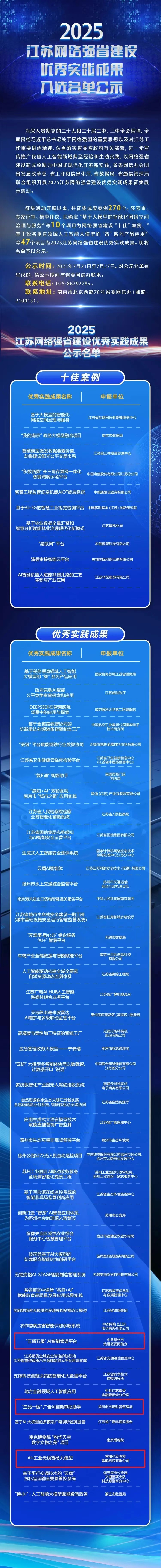 近日由省委網信辦會同省發(fā)展改革委、省工業(yè)和信息化廳、省數據局、省通信管理局聯合組織開展的2025江蘇網絡強省建設優(yōu)秀實踐成果入選名單正式公示