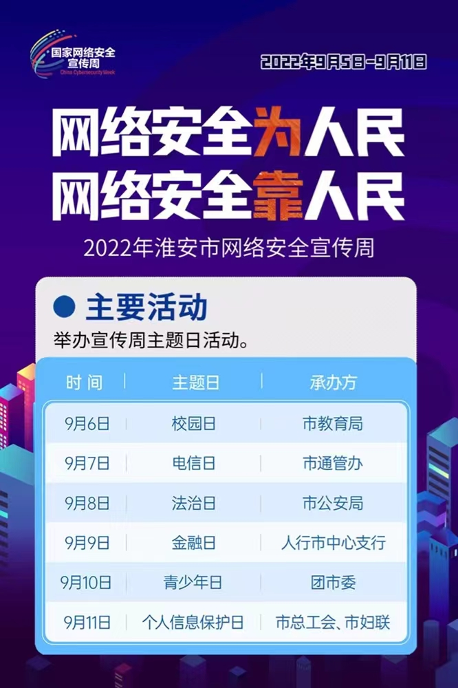 2022年淮安市網(wǎng)絡(luò)安全宣傳周將以“網(wǎng)絡(luò)安全為人民 網(wǎng)絡(luò)安全靠人民”為主題,市、縣(區(qū))同步舉辦“校園日、電信日、法治日、金融日、青少年日、個人信息保護(hù)日”系列主題日活動,廣泛開展網(wǎng)絡(luò)安全線上宣傳和線下普及活動,著力提升各地各部門和全社會網(wǎng)絡(luò)安全意識,讓網(wǎng)絡(luò)安全更加深入人心。