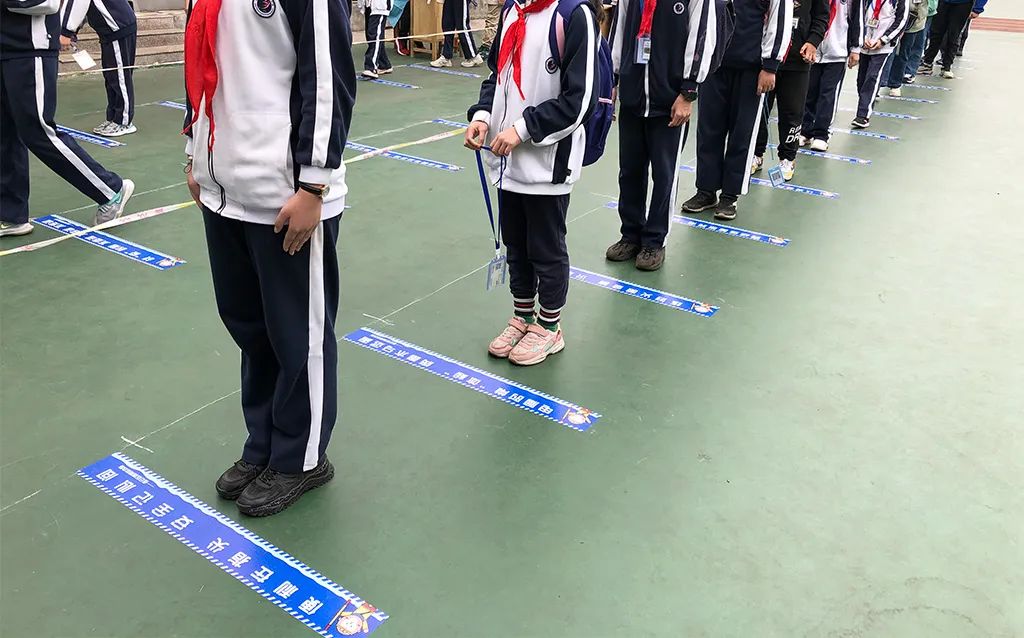 5月12日,在連云港市墟溝小學(xué)教育集團操場上的核酸檢測采樣點,同學(xué)們一邊排隊一邊小聲讀著“一米線”上的內(nèi)容。學(xué)校核酸檢測的“一米線”印上了這些網(wǎng)絡(luò)普法內(nèi)容的小貼士,變成了疫情防控與網(wǎng)絡(luò)文明結(jié)合的小小宣傳欄。