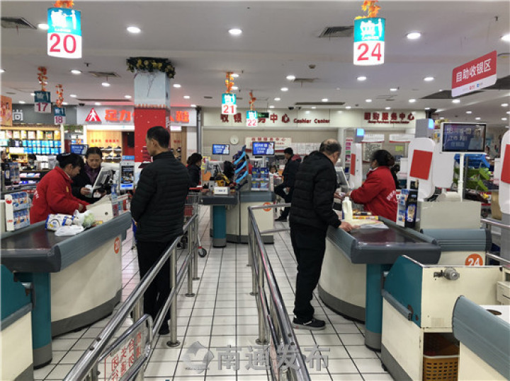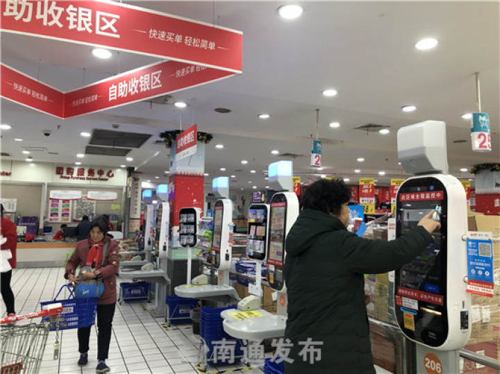 位于南通市區(qū)南大街商圈的大潤發(fā)八仙城店,是周邊老年顧客喜愛光顧的一家大型超市。下午5點(diǎn),三條人工收銀通道逐漸擁擠了起來。眼看著隊(duì)伍越來越長,大潤發(fā)八仙城店總經(jīng)理王中偉開始疏導(dǎo)顧客:“往這邊走,手機(jī)支付寶自助結(jié)賬,不用排隊(duì)!”