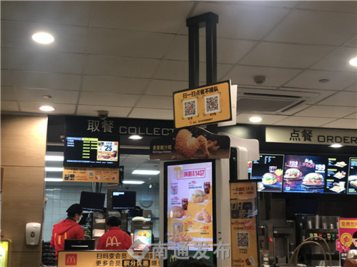 7日下午,記者來到南通市區(qū)中南城商圈,首先走進(jìn)一家麥當(dāng)勞。柜臺(tái)前、餐桌上,到處都貼著二維碼,并提示“掃一掃 點(diǎn)餐不排隊(duì)”。當(dāng)記者詢問店員,想用現(xiàn)金支付、是否可以人工點(diǎn)單時(shí),店員引導(dǎo)記者來到一旁的自助點(diǎn)餐機(jī)前,告知可以在屏幕上點(diǎn)選需要的商品。選好后,店員幫忙操作打印出一張單子,隨后又帶記者到前臺(tái)付款找零,并提醒小票上有取餐碼,請(qǐng)留意叫號(hào)。整個(gè)過程還是比較順利的,相比手機(jī)自助點(diǎn)單,多花的一兩分鐘主要是在收銀環(huán)節(jié)。