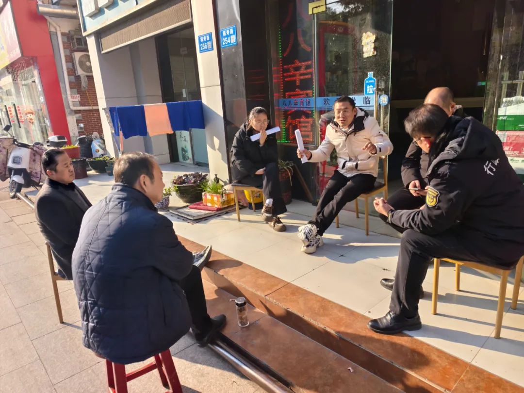 八辛賓館門前,城南社區(qū)工作人員聯(lián)合相關(guān)單位和業(yè)主、商戶進行溝通 圖源:如皋發(fā)布