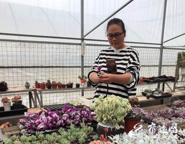 5月12日上午,在沭陽縣耿圩鎮(zhèn)“一畝田多肉農(nóng)場”,明媚的陽光照進(jìn)大棚,各色多肉植物密密麻麻地擺滿育苗床,偶有花盡情綻放、高挑艷麗。吳興艷調(diào)整三腳架,打開軟件,面對鏡頭開啟了一天的直播帶貨。