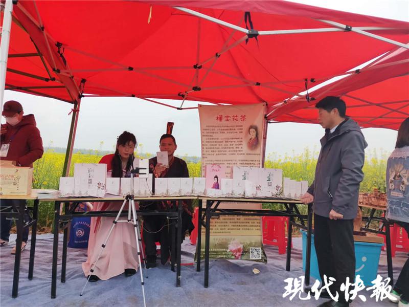 △魏良余(右一)在木槿花茶攤位。受訪者供圖