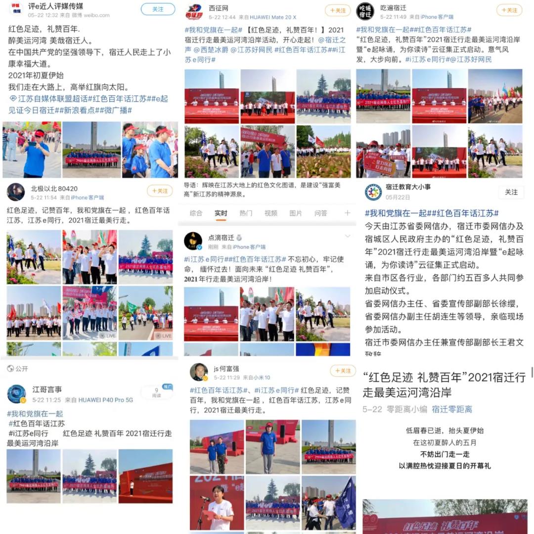 活動過程中,宿遷網(wǎng)絡(luò)人士發(fā)揮各自平臺影響力,帶#i江蘇e同行# #我和黨旗在一起#等話題,形成自媒體平臺宣傳矩陣,以圖文、視頻直播等形式讓革命文化從網(wǎng)下走到網(wǎng)上,為展示“強富美高”新江蘇、構(gòu)建清朗網(wǎng)絡(luò)空間注入一抹“宿遷紅”。