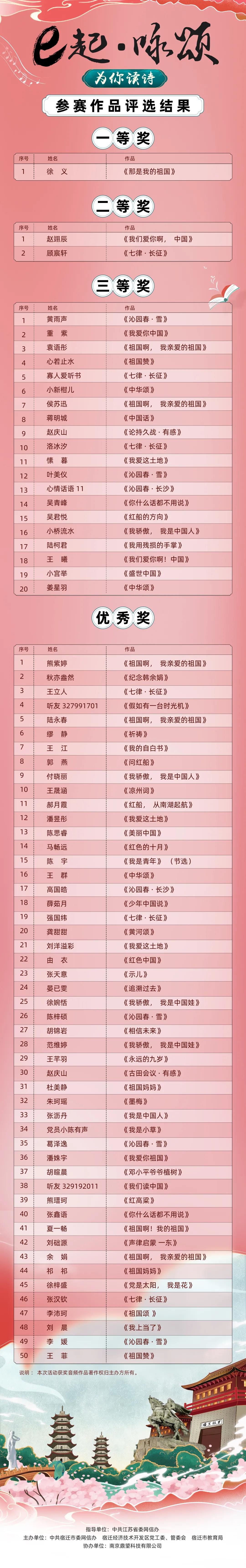 最后,要公布“e起·詠頌 為你讀詩”云征集活動參賽作品評選結(jié)果啦!快看看你是不是上榜了?
