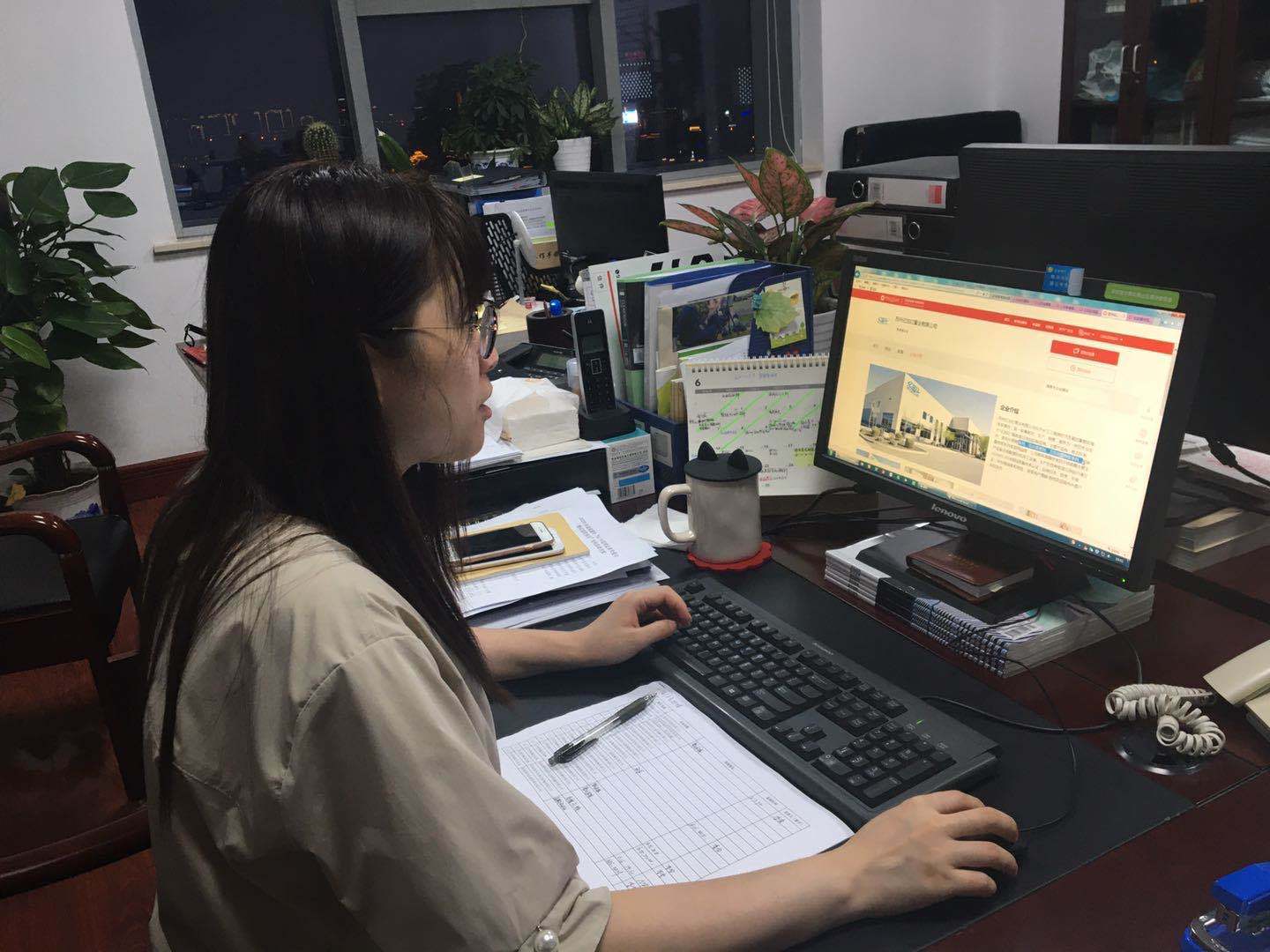 張家港市商務(wù)局工作人員網(wǎng)上“巡館”,查看張家港企業(yè)線上參展情況