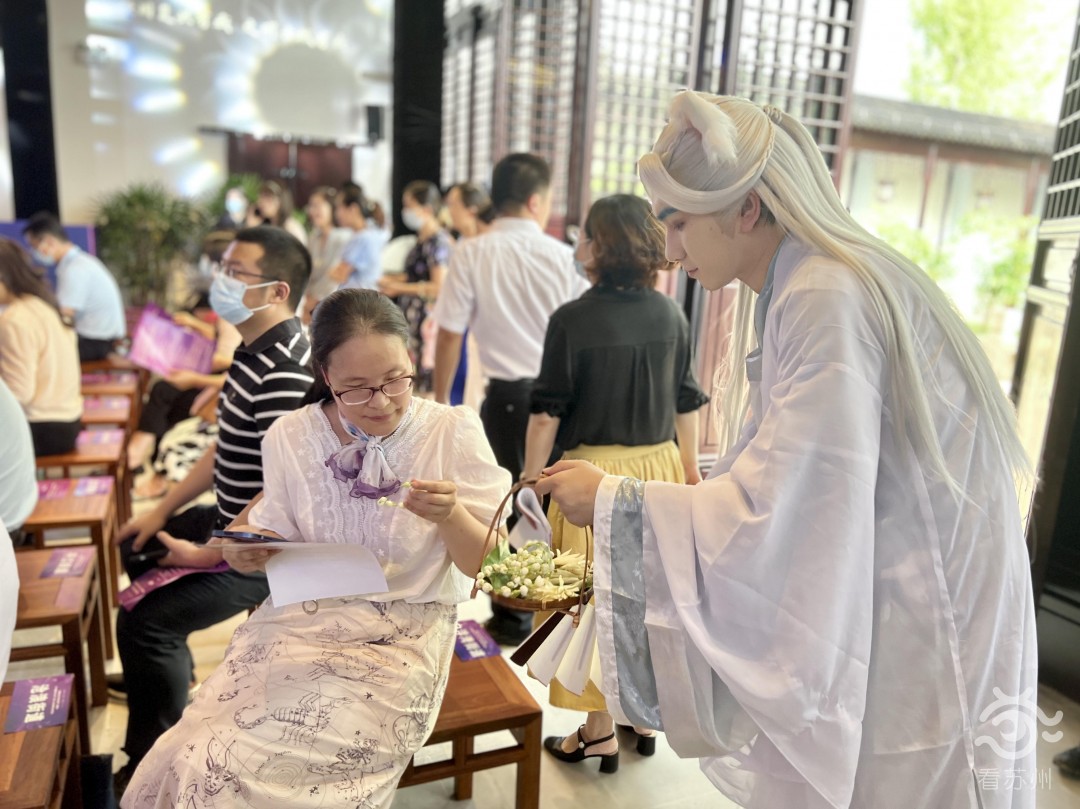 來到開幕式現(xiàn)場,7名漢服達(dá)人身穿華服,cosplay成姑蘇七貍的形象,貫穿于整場活動中?;蛑敢e客入座,或?yàn)橘e客奉上香氣濃郁的玉蘭花手鏈,讓人仿佛置身江南水墨畫中,姑蘇韻味濃厚。