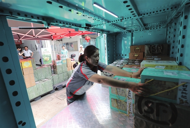 快遞員施利芬和工友一起完成裝車,這輛車滿載約200箱枇杷。