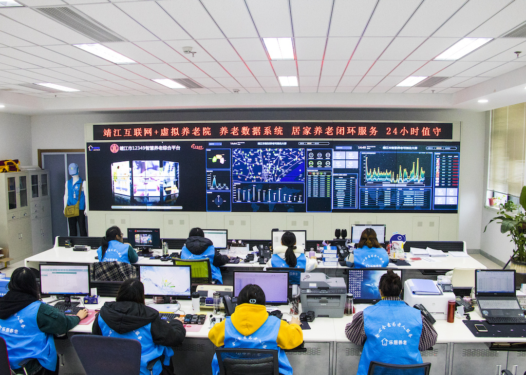 “歡迎撥打12349為老服務(wù)熱線。”“好的,我來聯(lián)系附近的助老員,請稍等?!薄K省靖江市智慧養(yǎng)老服務(wù)平臺內(nèi),工作人員正忙著聯(lián)系調(diào)度,電子屏數(shù)據(jù)不斷跳動更新著,代表著活躍在城鄉(xiāng)各處的助老員正在服務(wù)中。